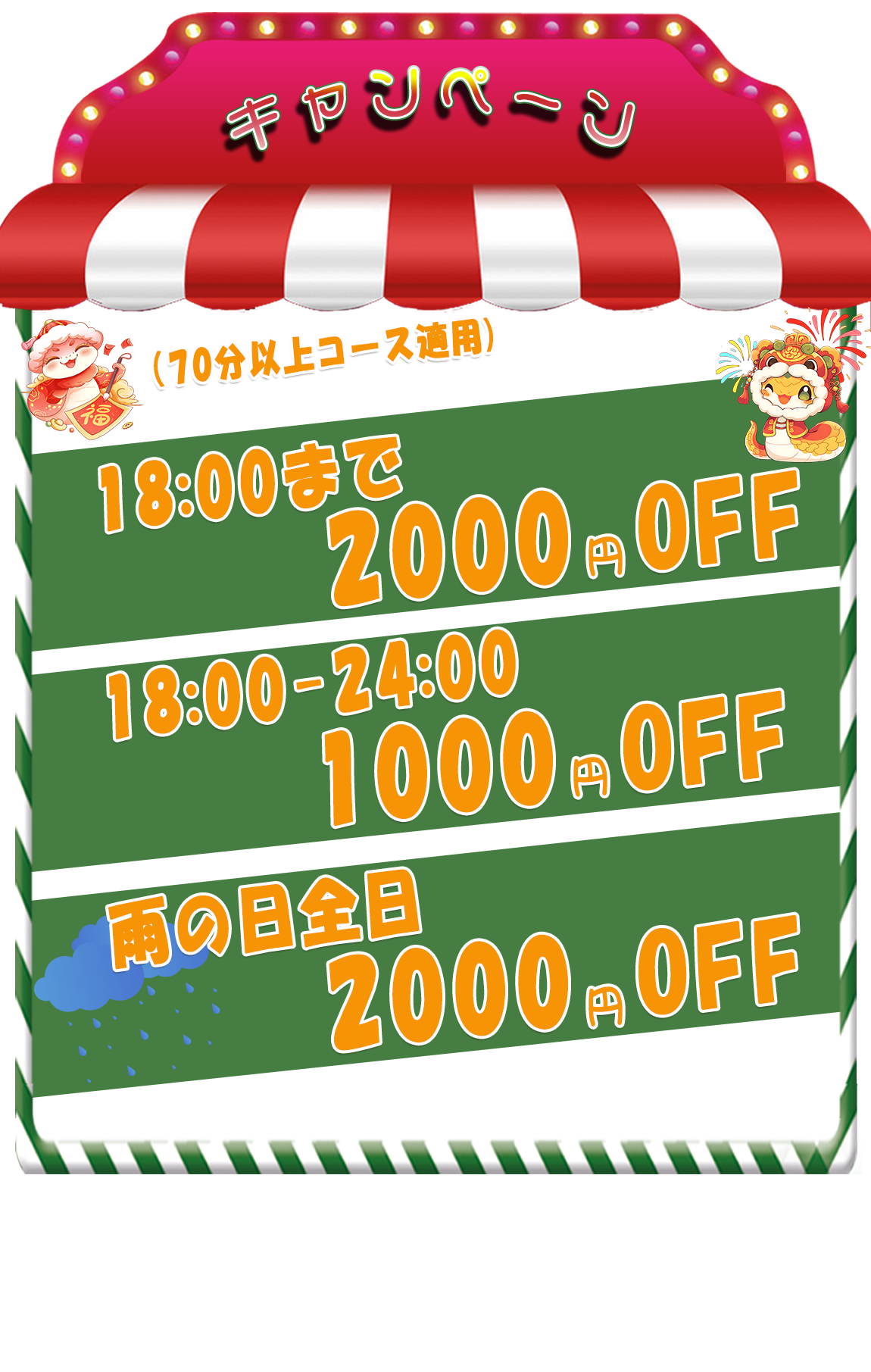 | 2月キャンペーン 2026-02-07 70分以上のコース 18:00まで 2000円割引!!! 18:00-24:00 1000円割引!!! |