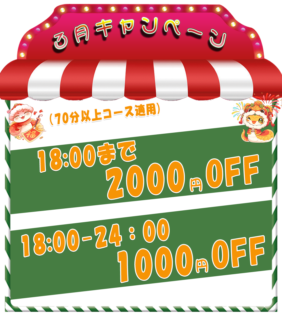 | 3月キャンペーン 2026-03-14 70分以上のコース 18:00まで 2000円割引!!! 18:00-24:00 1000円割引!!! |